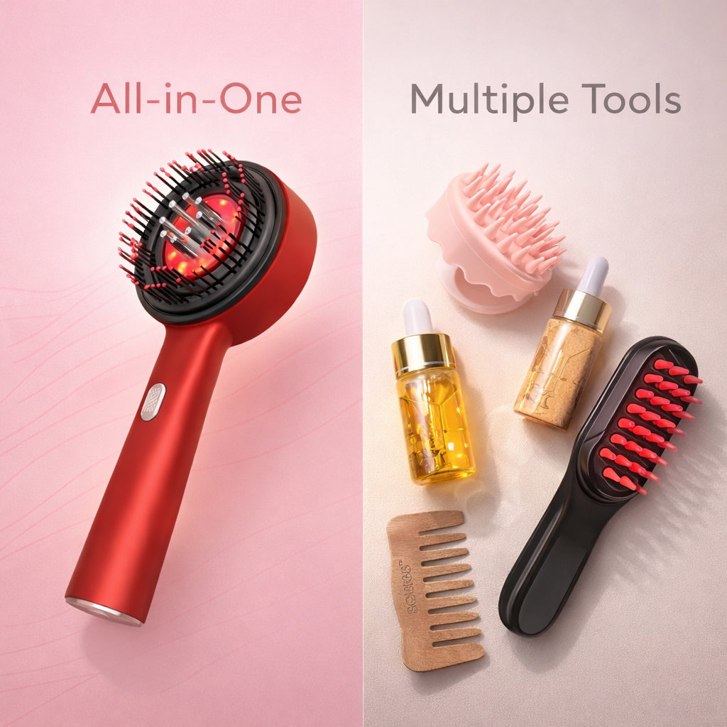 While regular combs, massagers, or manual oil application perform only one function, TrichoGlow combines everything in a single device — saving time, money, and effort
